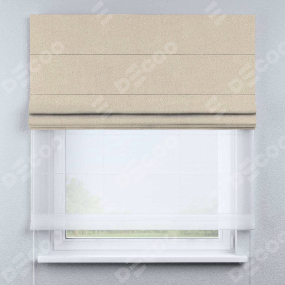 Двойная римская штора «День-ночь» от производителя Cortin предназначена для использования в проёмах. Эта штора уникальна тем, что состоит из двух полотен. На лицевой стороне находится однотонный блэкаут кофейно-бежевый (артикул: 91566−1), обеспечивающий эффективное затемнение. В комплект также входит вторая ткань — легкий белый тюль (артикул: V-01), который добавляет изящества и легкости оформлению окна. Кроме того, доступны и другие разновидности ткани тюль, выбор которых доступен по ссылке .