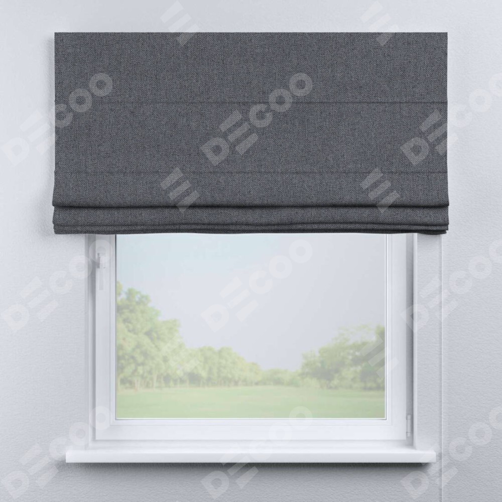 Классическая римская штора производителя «Cortin», пошита из ткани лён блэкаут тёмно-серый, артикул: 139663. Имеет универсальный механизм и подходит для монтажа: на потолок, на стену и в нишу.