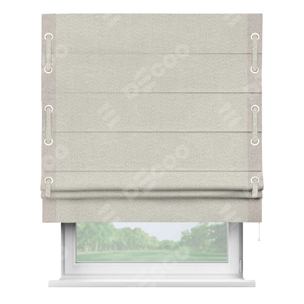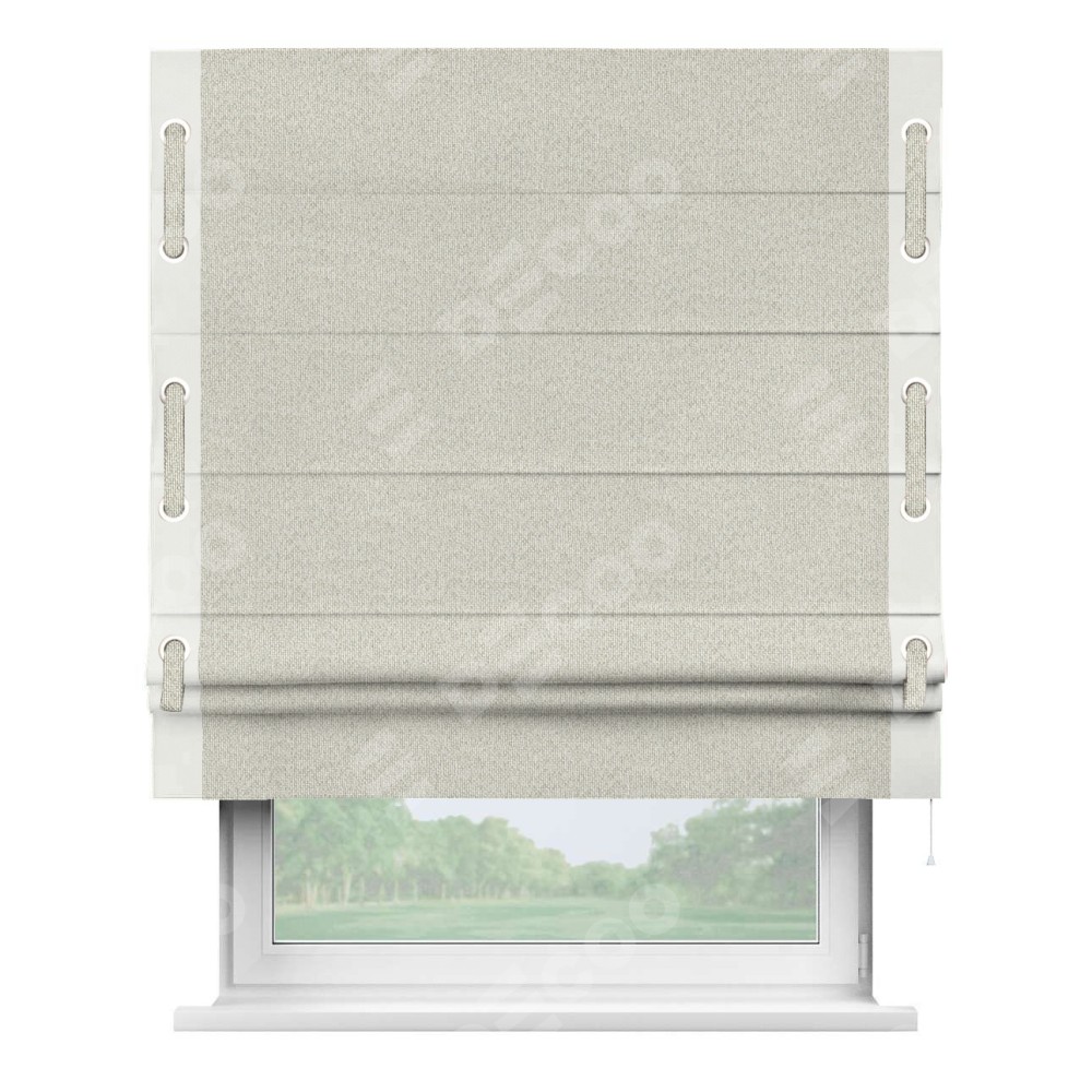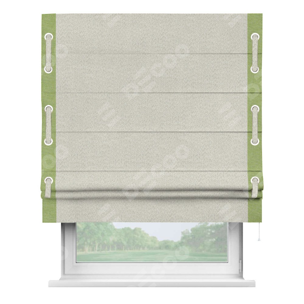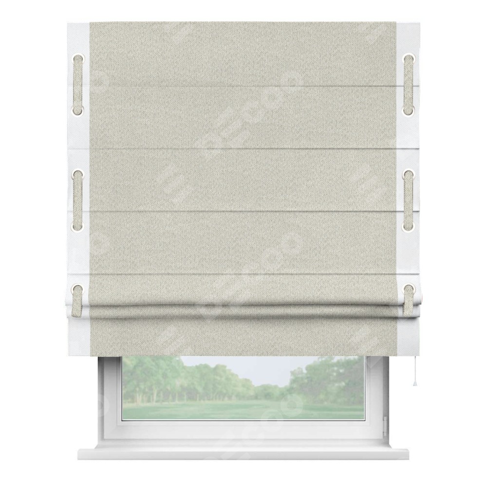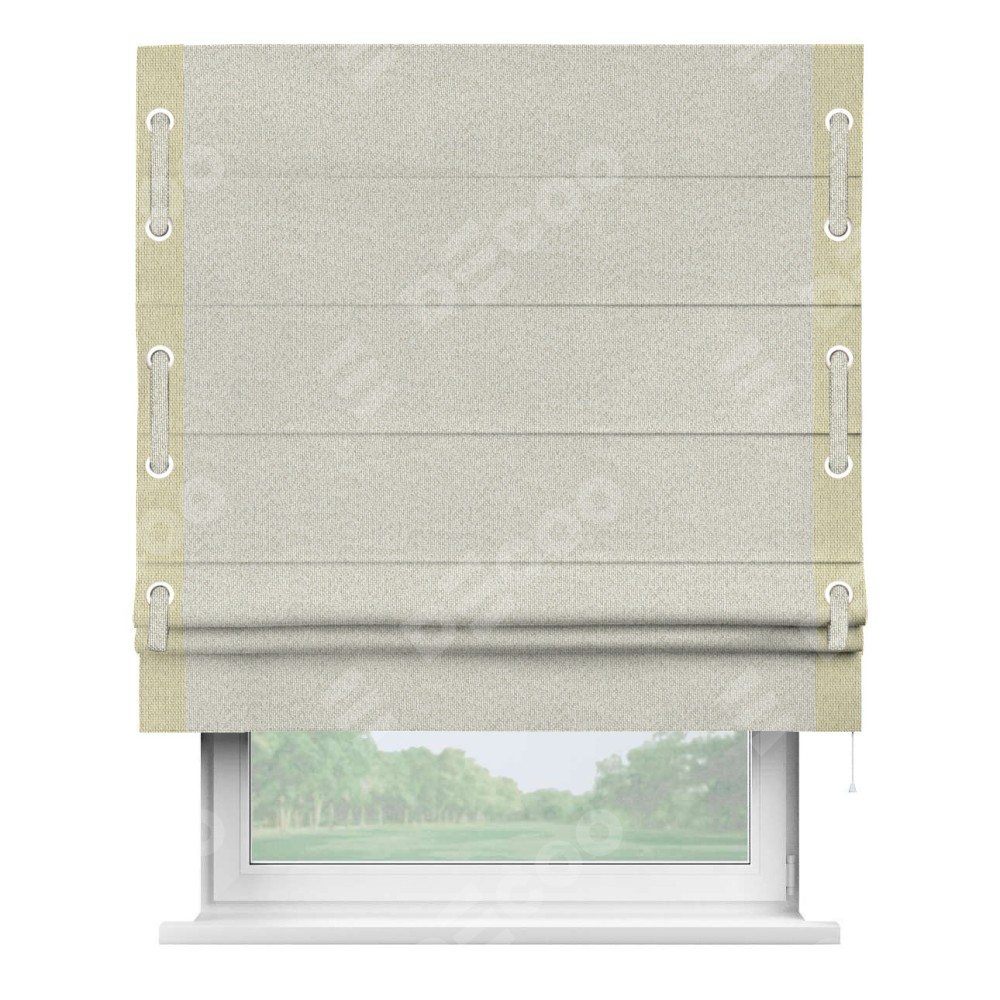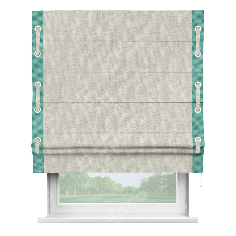 Римская штора «Cortin» для проёма, лён димаут светло-бежевый с кантом Стрим Дуо (люверсы с пояском)