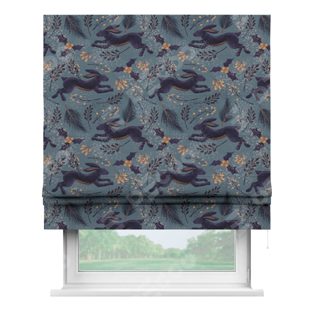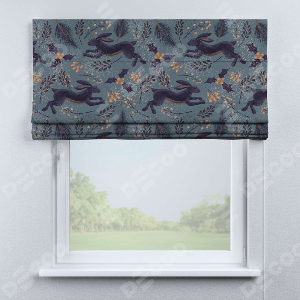 Классическая римская штора производителя «Cortin», пошита из ткани дарк арт зайцы, артикул:. Имеет универсальный механизм и подходит для монтажа: на потолок, на стену и в нишу.