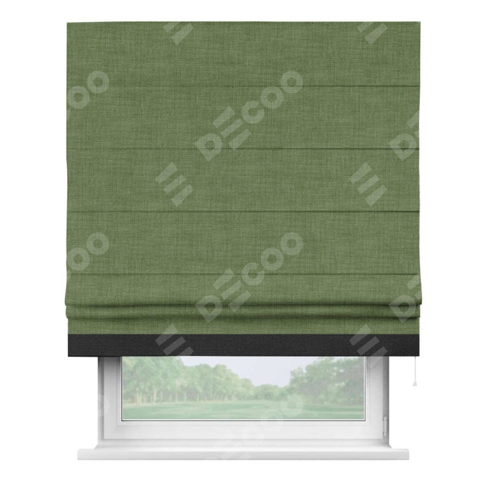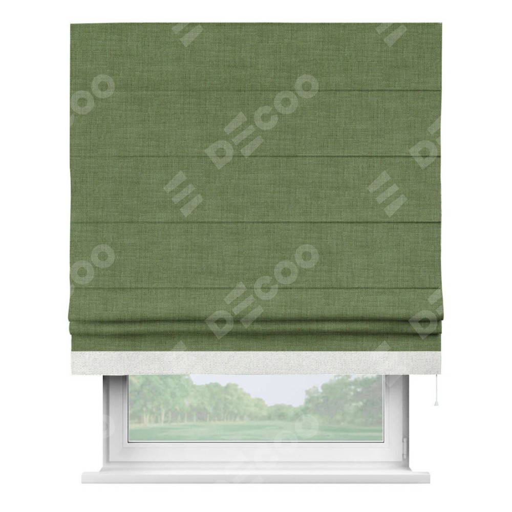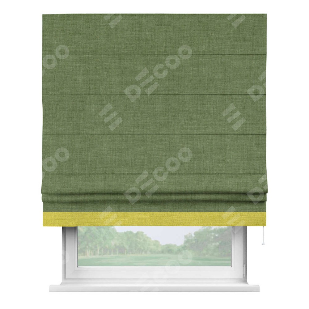 Классическая римская штора производителя «Cortin», пошита из ткани лён зелёный, артикул: 131547. Имеет универсальный механизм и подходит для монтажа: на потолок, на стену и в нишу.