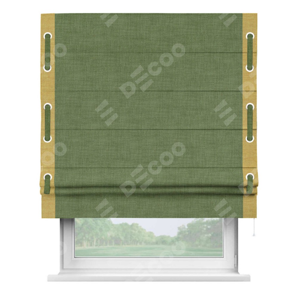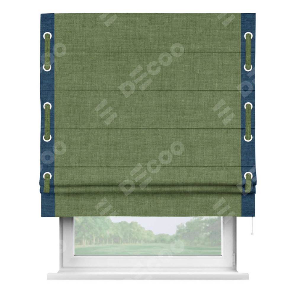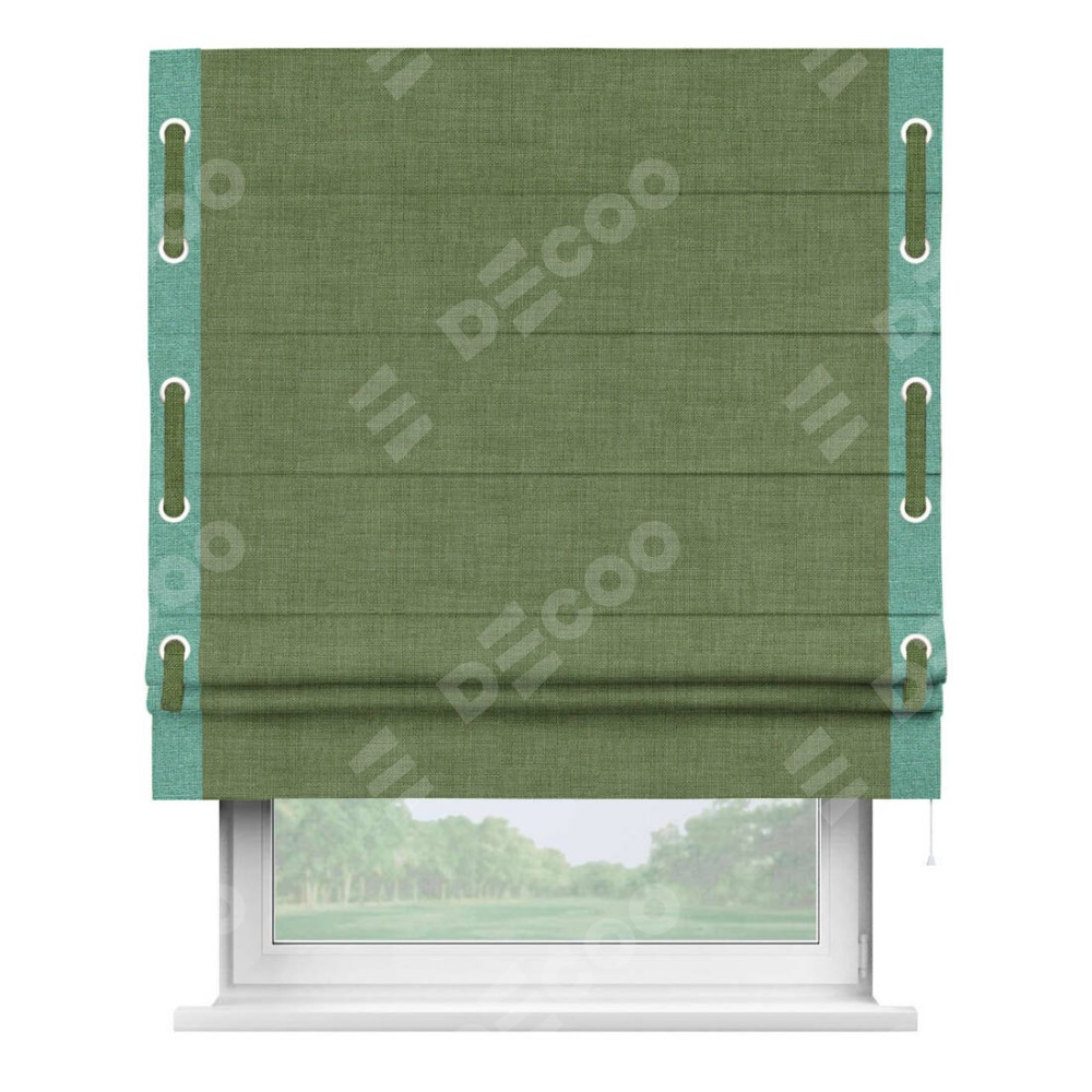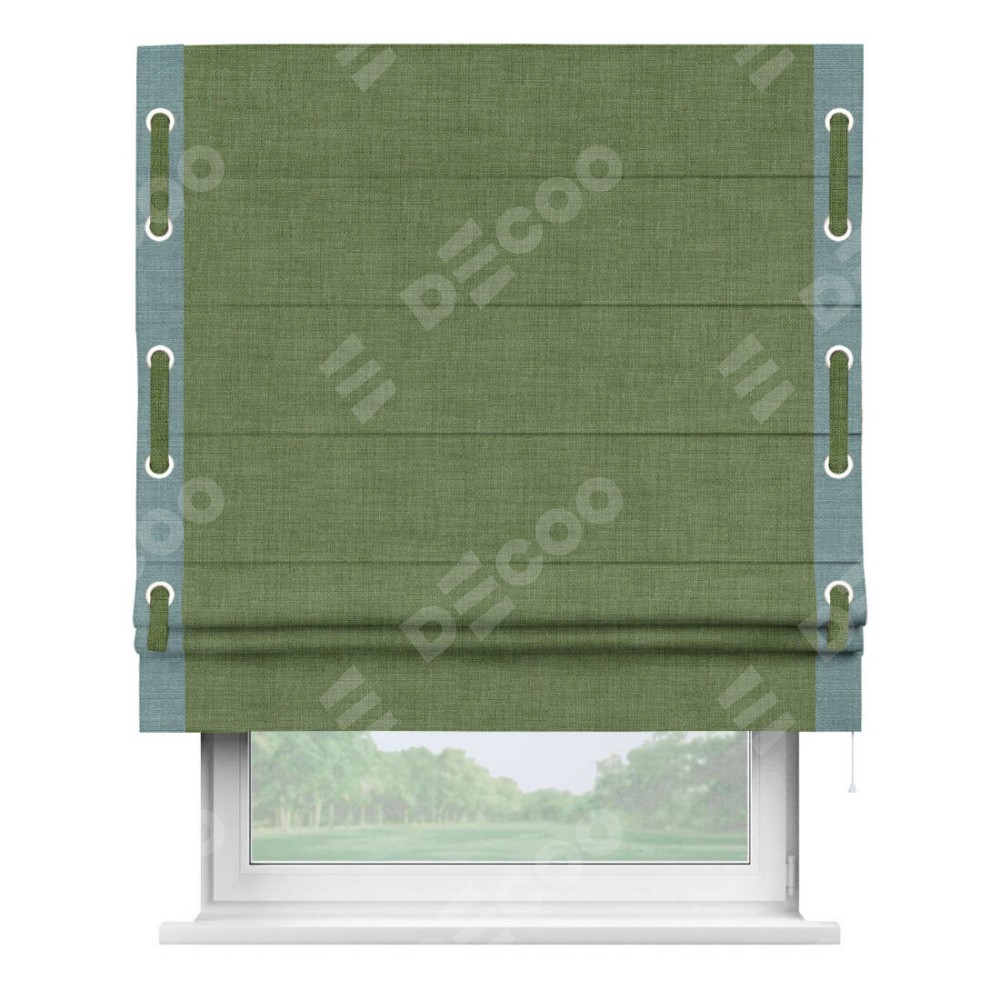 Римская штора «Кортин» для проёма, лён зелёный, с кантом Стрим Дуо (люверсы с пояском)