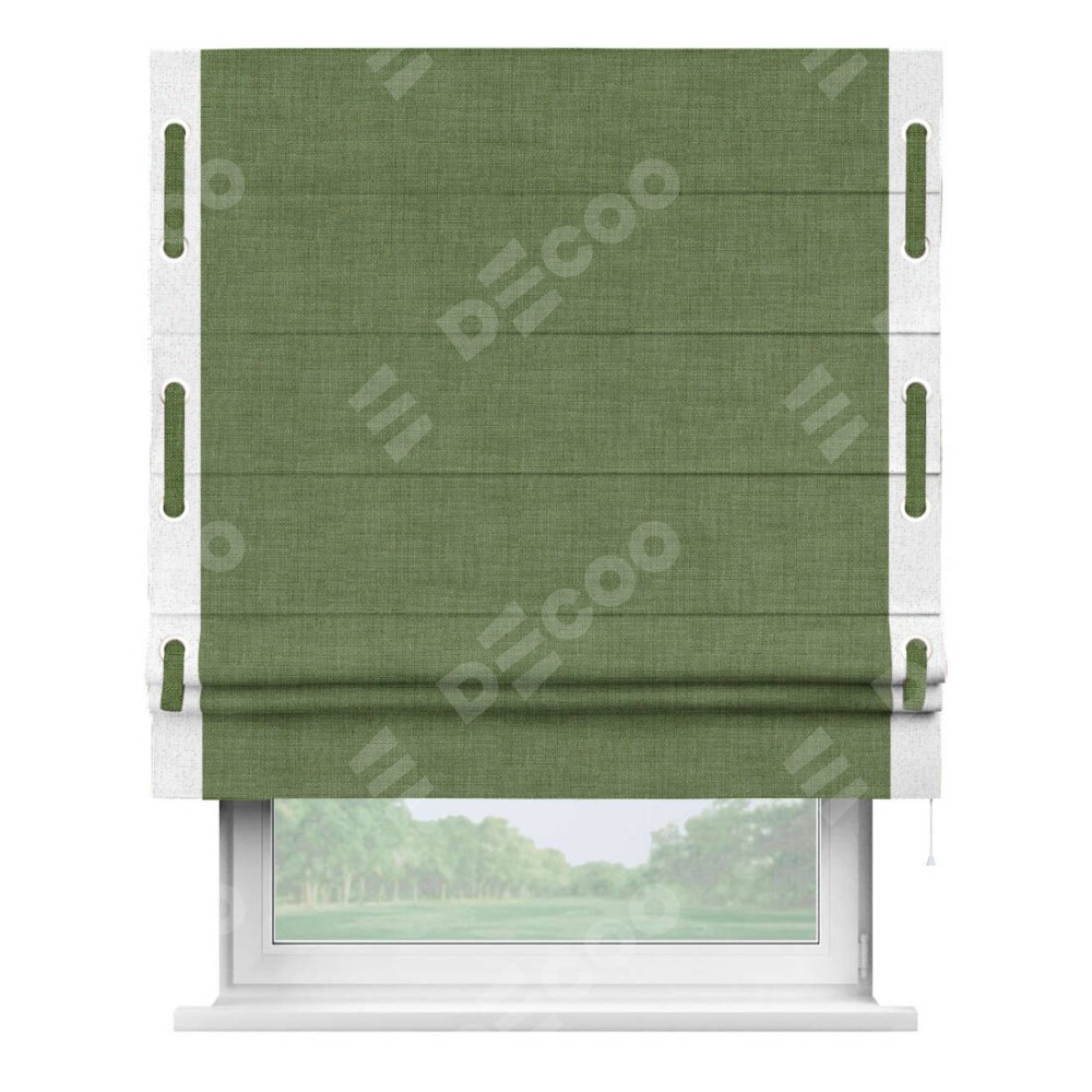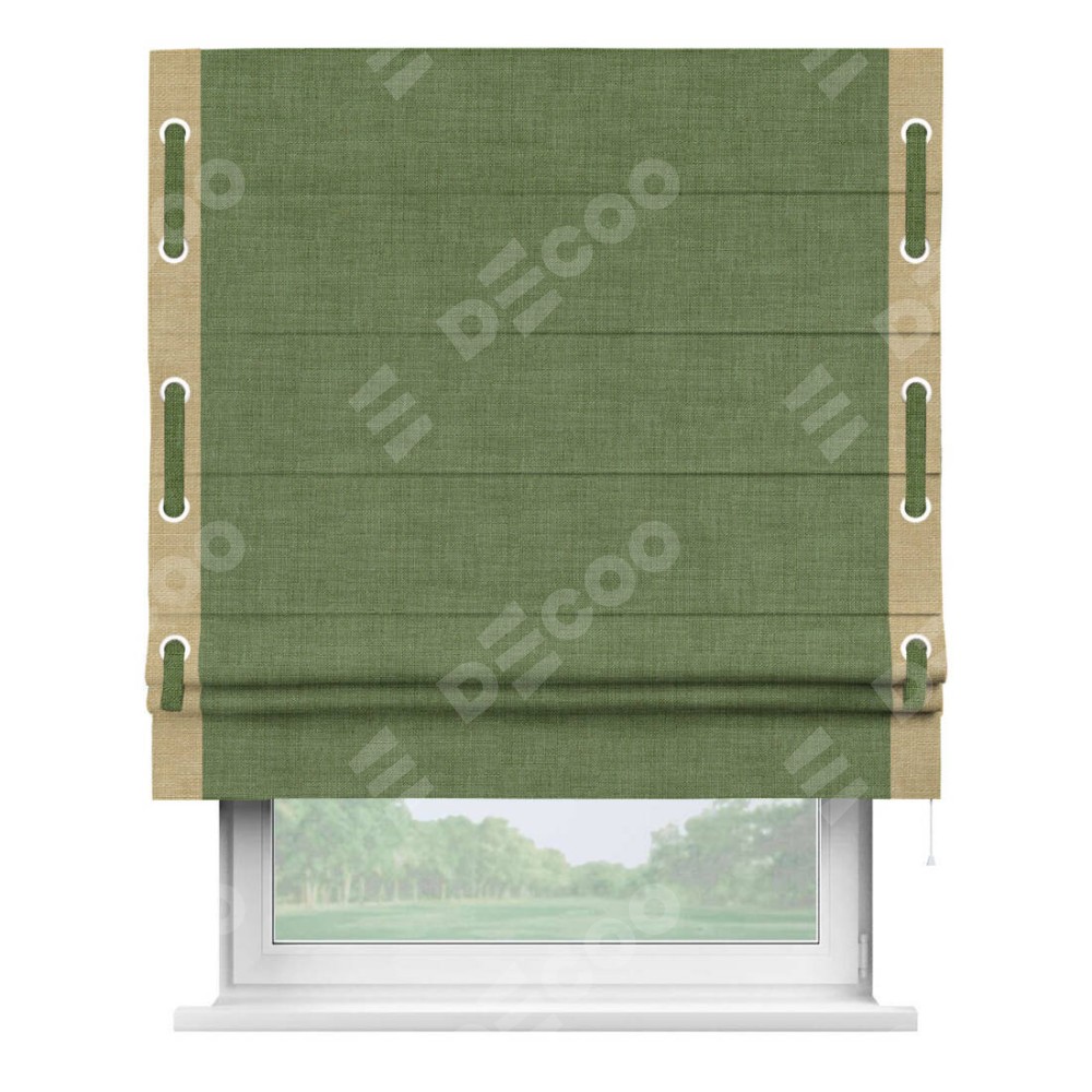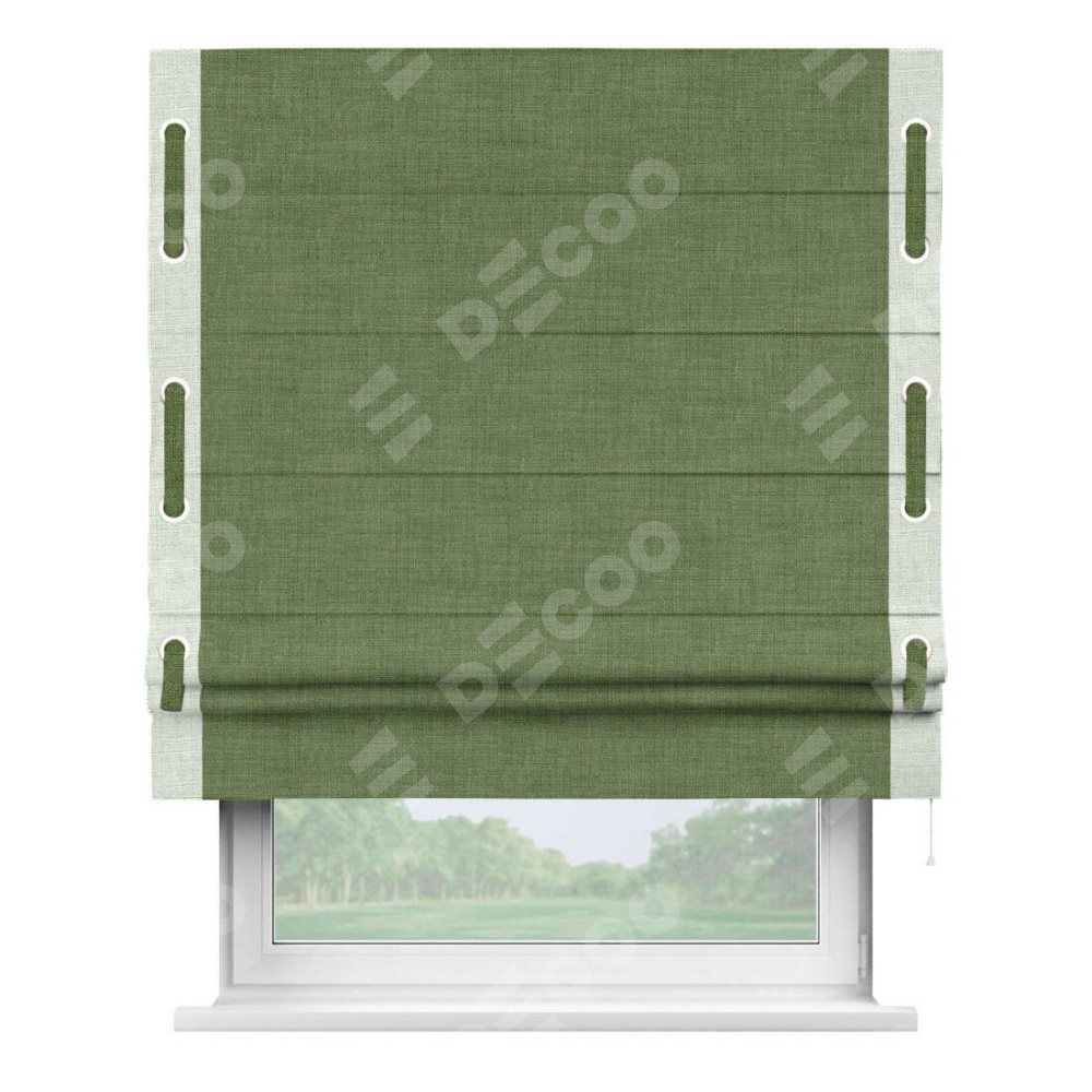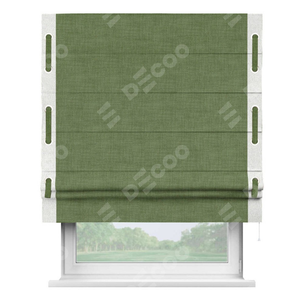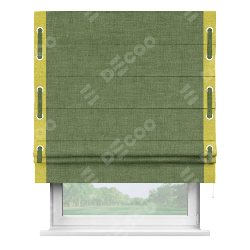 Римская штора «Кортин» для проёма, лён зелёный, с кантом Стрим Дуо (люверсы с пояском)
