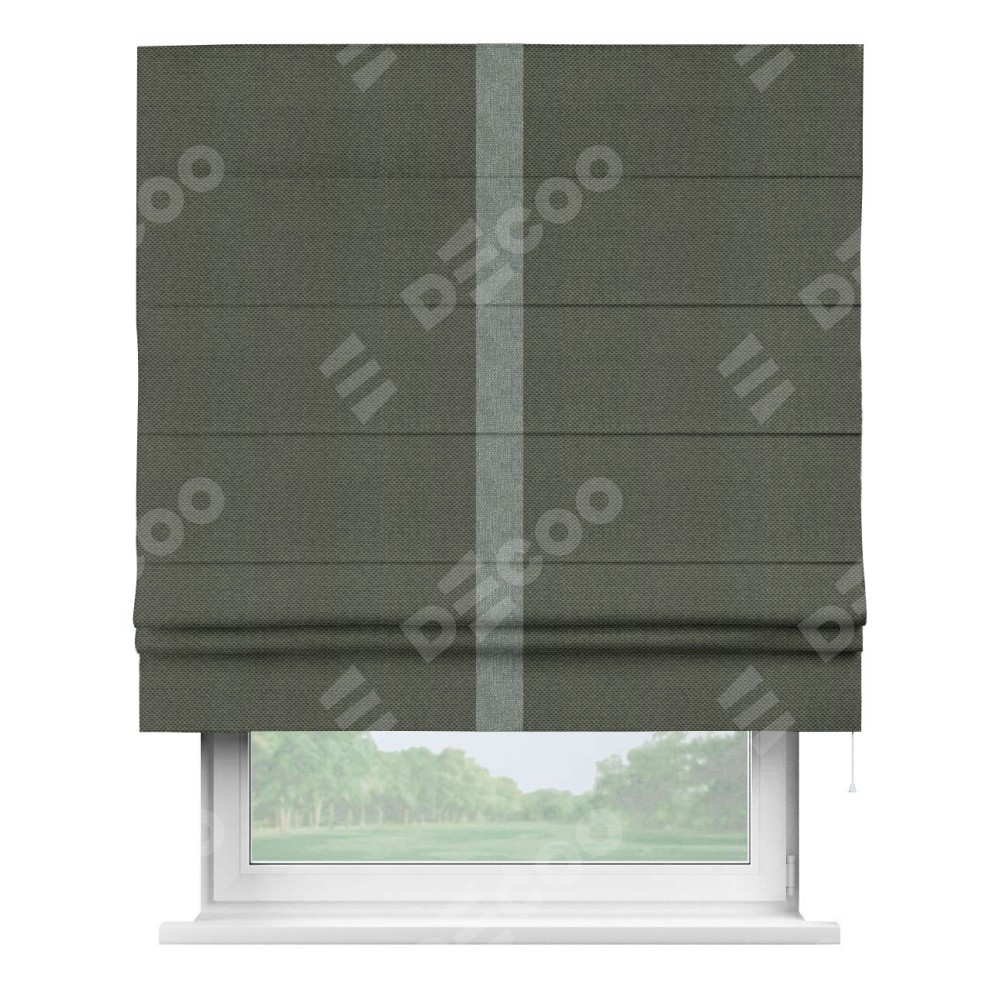 Римская штора производителя «Cortin», используется для проёма, пошита из ткани лён димаут графит, артикул 27. Отделка шторы кантом «Хайвэй», ткань для канта используется из льна димаут разной расцветки на выбор. Имеет универсальный механизм и подходит для монтажа: на потолок, на стену и в нишу.