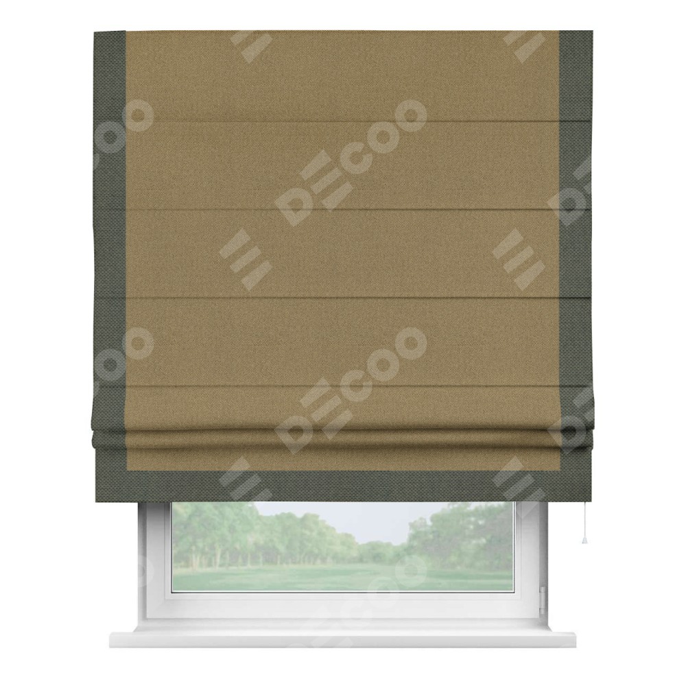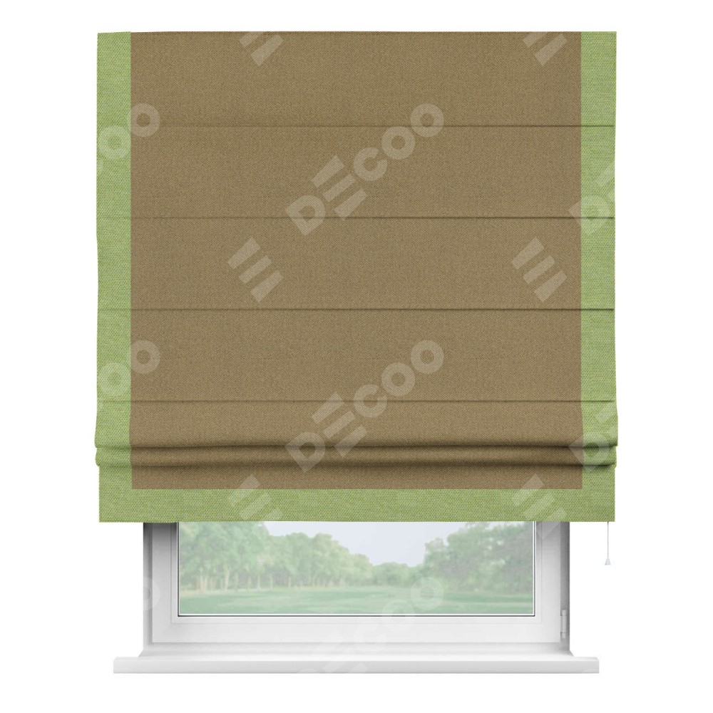 Римская штора производителя «Cortin», используется для проёма, пошита из ткани лён димаут оливковый, артикул 16243. Отделка шторы кантом «Виктория», ткань для канта используется из льна димаут разной расцветки на выбор. Имеет универсальный механизм и подходит для монтажа: на потолок, на стену и в нишу.