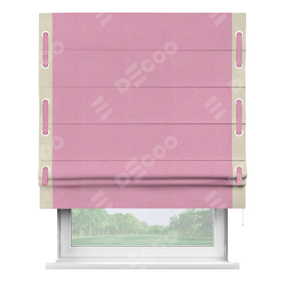 Римская штора производителя «Cortin», используется для проёма, пошита из ткани лён димаут розовый, артикул 16257. Отделка шторы кантом «Стрим Дуо» на кантах расположены люверсы с пояском, ткань для канта используется лён димаут разной расцветки на выбор. Ткань для пояска обычно используется из основной ткани шторы, а так же можно сделать из любой расцветки по желанию. Имеет универсальный механизм и подходит для монтажа: на потолок, на стену и в нишу.