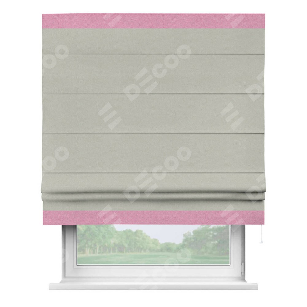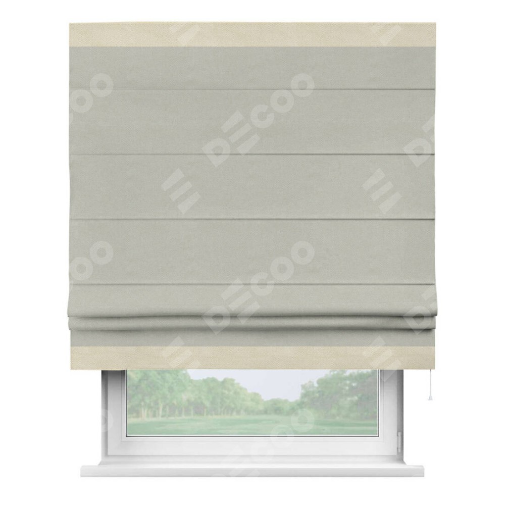 Римская штора производителя «Cortin», используется для проёма, пошита из ткани лён димаут светло-серый, артикул 83025. Отделка шторы кантом «Горизонт», ткань для канта используется из льна димаут разной расцветки на выбор. Имеет универсальный механизм и подходит для монтажа: на потолок, на стену и в нишу.