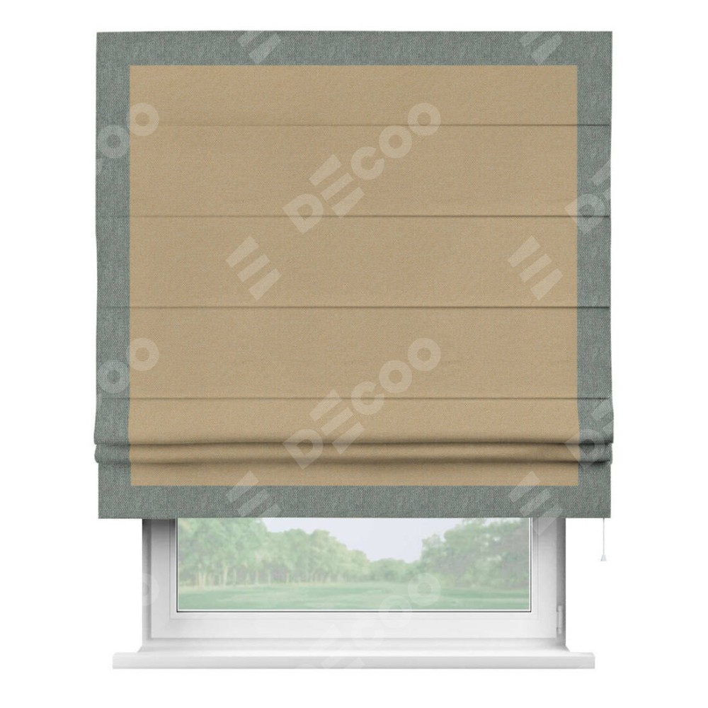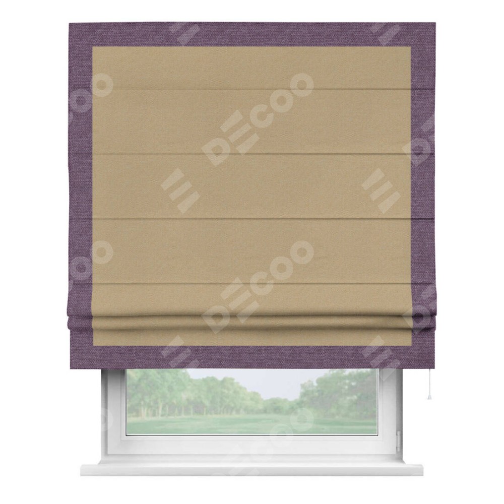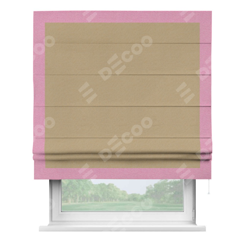 Римская штора производителя «Cortin», используется для проёма, пошита из ткани лён димаут тёмно-бежевый, артикул 83037. Отделка шторы кантом «Чесс», ткань для канта используется из льна димаут разной расцветки на выбор. Имеет универсальный механизм и подходит для монтажа: на потолок, на стену и в нишу.