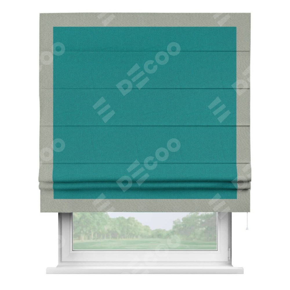 Римская штора производителя «Cortin», используется для проёма, пошита из ткани лён димаут тёмно-бирюзовый, артикул 318. Отделка шторы кантом «Чесс», ткань для канта используется из льна димаут разной расцветки на выбор. Имеет универсальный механизм и подходит для монтажа: на потолок, на стену и в нишу.