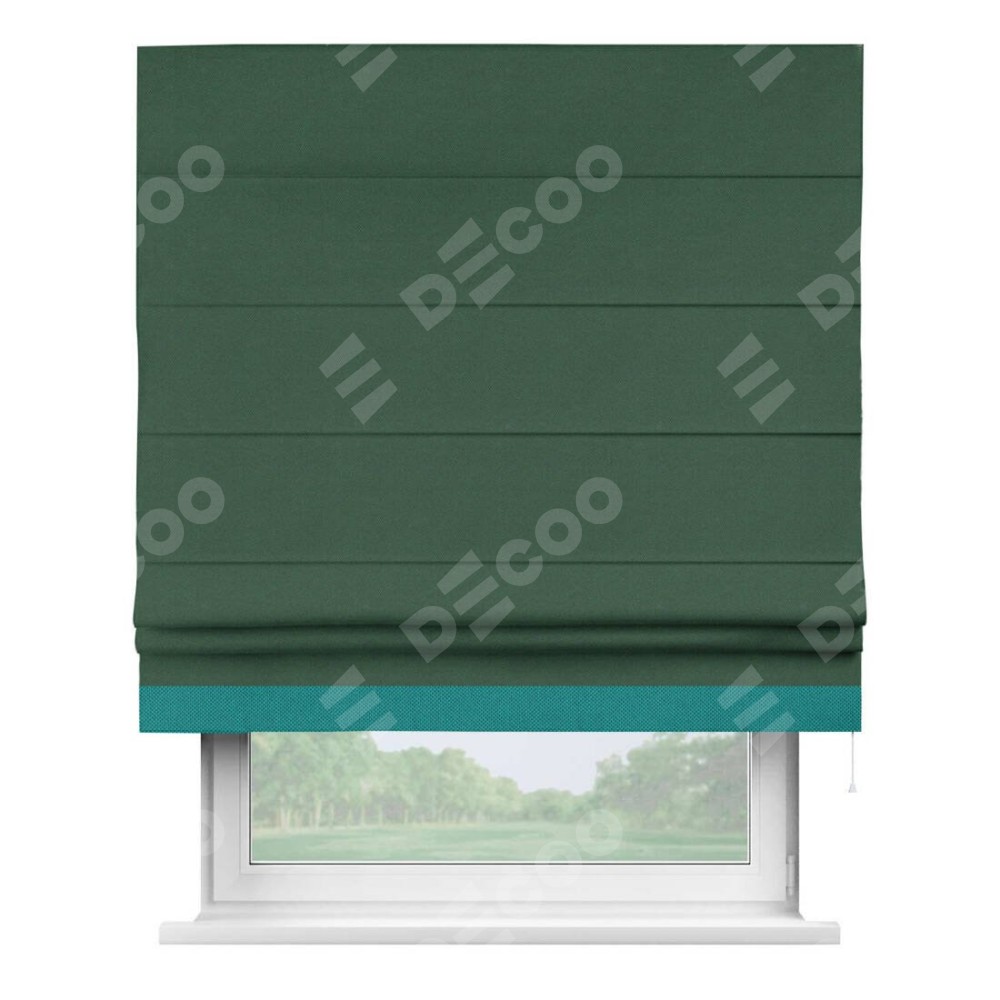Римская штора производителя «Cortin», используется для проёма, пошита из ткани лён димаут тёмно-зелёный, артикул 16246. Отделка шторы кантом «Джестер», ткань для канта используется из льна димаут разной расцветки на выбор. Имеет универсальный механизм и подходит для монтажа: на потолок, на стену и в нишу.