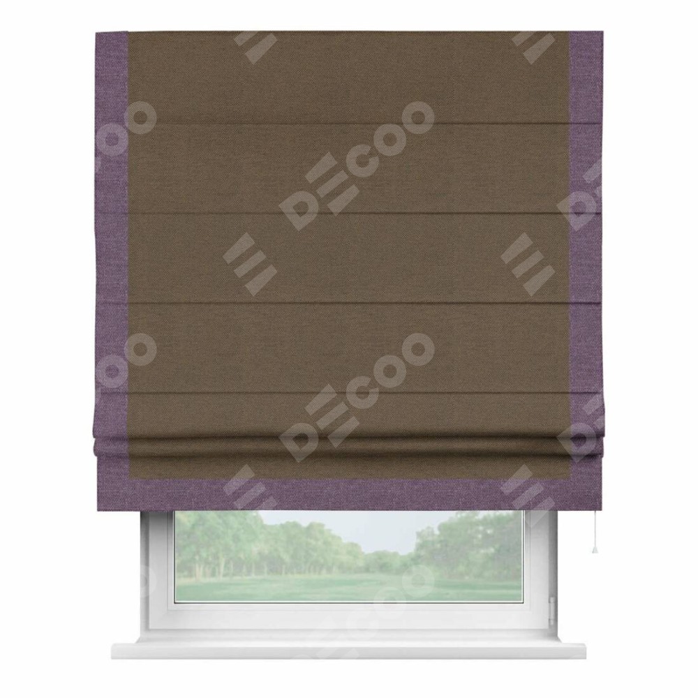 Римская штора производителя «Cortin», используется для проёма, пошита из ткани лён димаут тёмно-коричневый, артикул 83030. Отделка шторы кантом «Виктория», ткань для канта используется из льна димаут разной расцветки на выбор. Имеет универсальный механизм и подходит для монтажа: на потолок, на стену и в нишу.