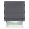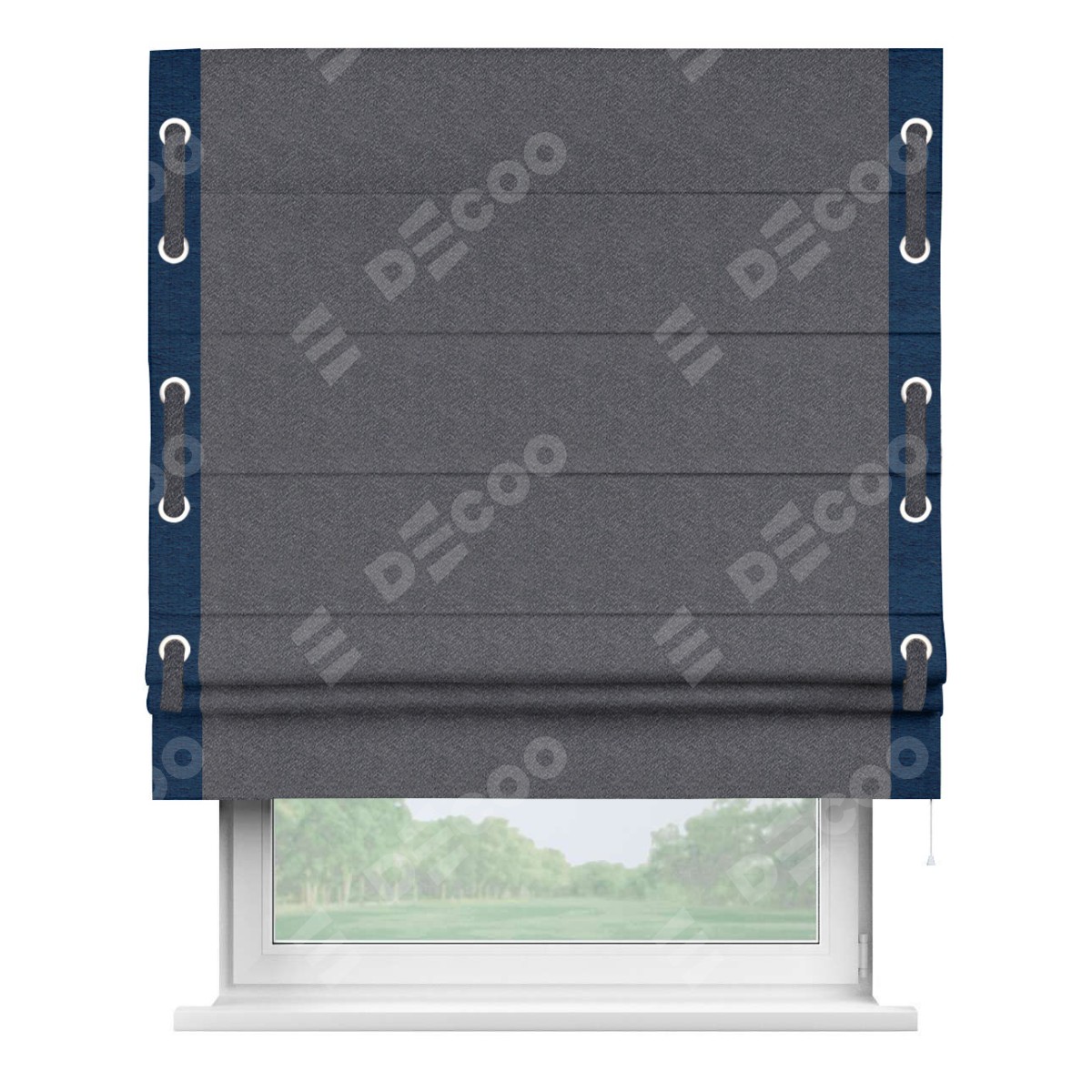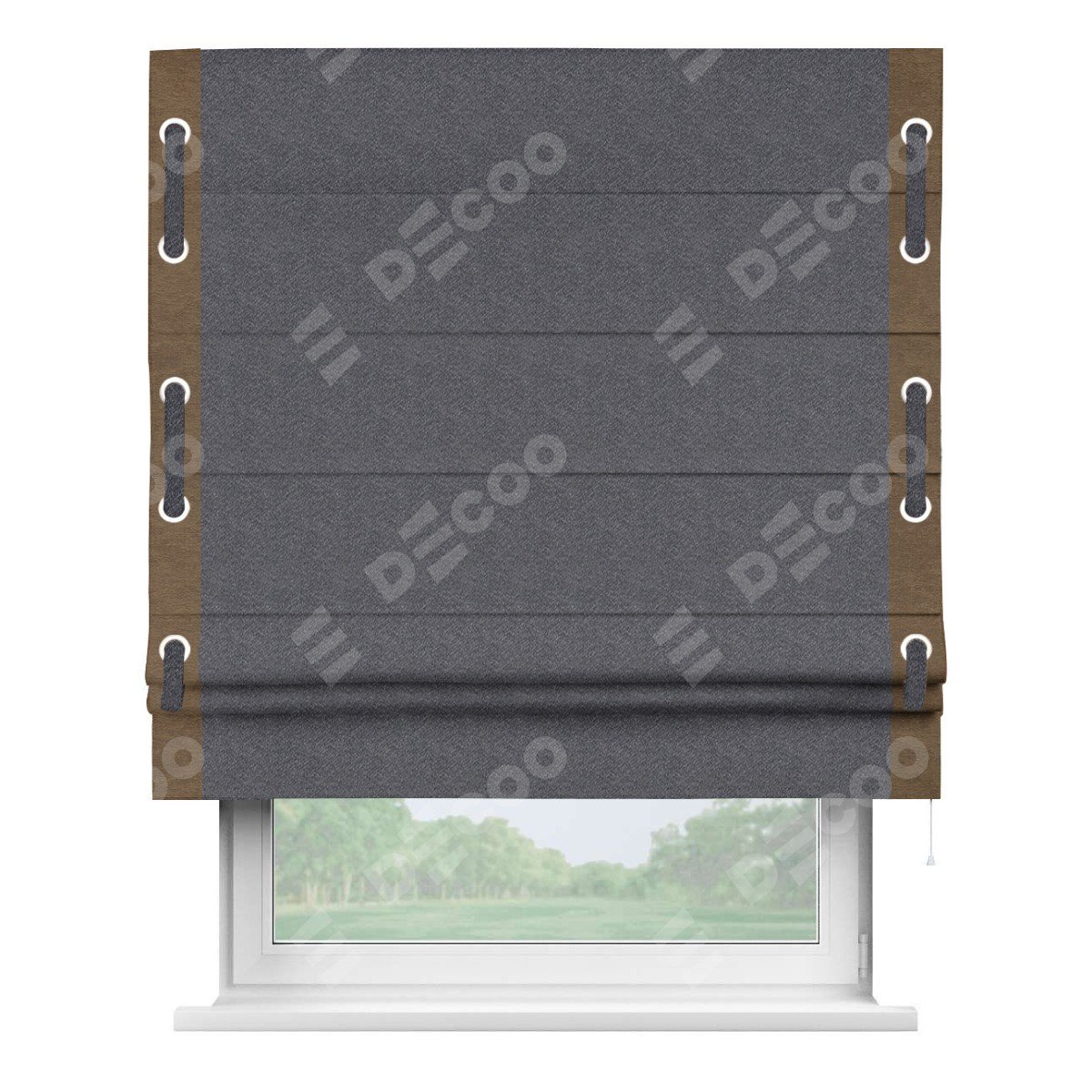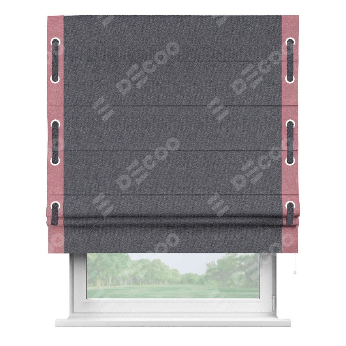 Римская штора производителя «Cortin», используется для проёма, пошита из ткани софт однотонный графит, артикул 19316. Отделка шторы кантом «Стрим Дуо» на кантах расположены люверсы с пояском, ткань для канта используется из софта разной расцветки на выбор. Ткань для пояска обычно используется из основной ткани шторы, а так же можно сделать из любой расцветки по желанию. Имеет универсальный механизм и подходит для монтажа: на потолок, на стену и в нишу.