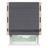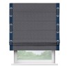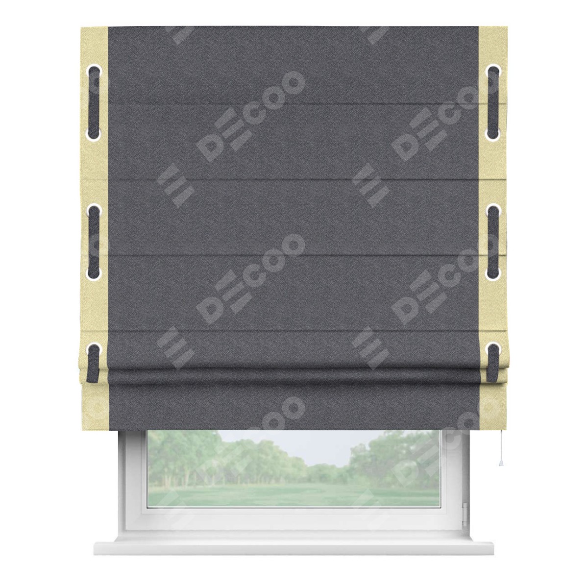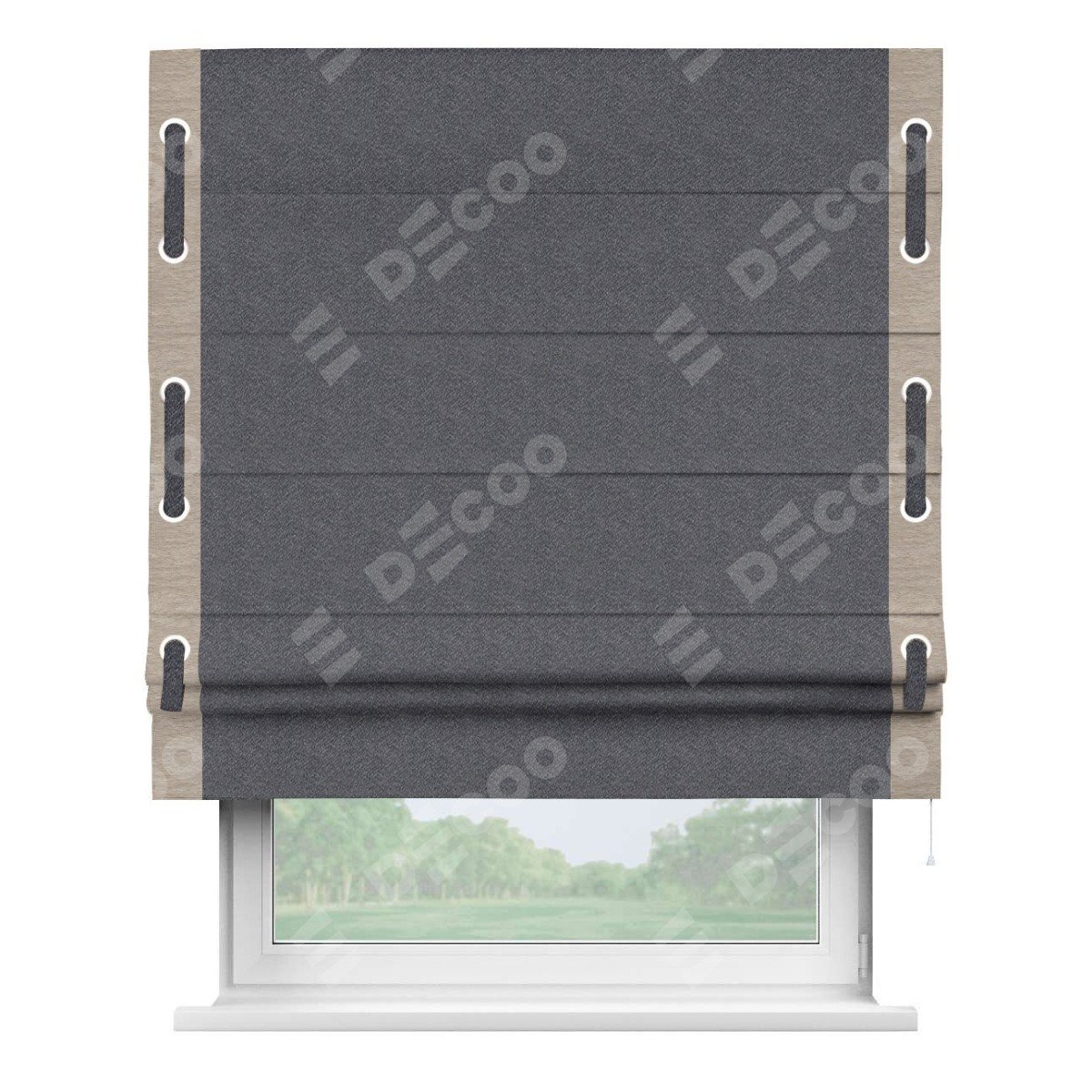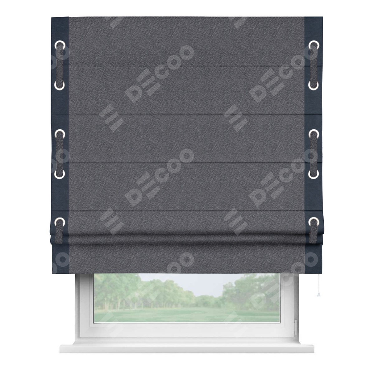 Римская штора производителя «Cortin», используется для проёма, пошита из ткани софт однотонный графит, артикул 19316. Отделка шторы кантом «Стрим Дуо» на кантах расположены люверсы с пояском, ткань для канта используется из софта разной расцветки на выбор. Ткань для пояска обычно используется из основной ткани шторы, а так же можно сделать из любой расцветки по желанию. Имеет универсальный механизм и подходит для монтажа: на потолок, на стену и в нишу.