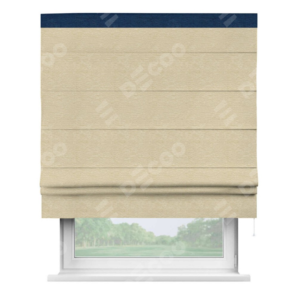 Римская штора производителя «Cortin», используется для проёма, пошита из ткани софт однотонный светло-бежевый, артикул 54426. Отделка шторы кантом «Кинг», ткань для канта используется из софта разной расцветки на выбор. Имеет универсальный механизм и подходит для монтажа: на потолок, на стену и в нишу.