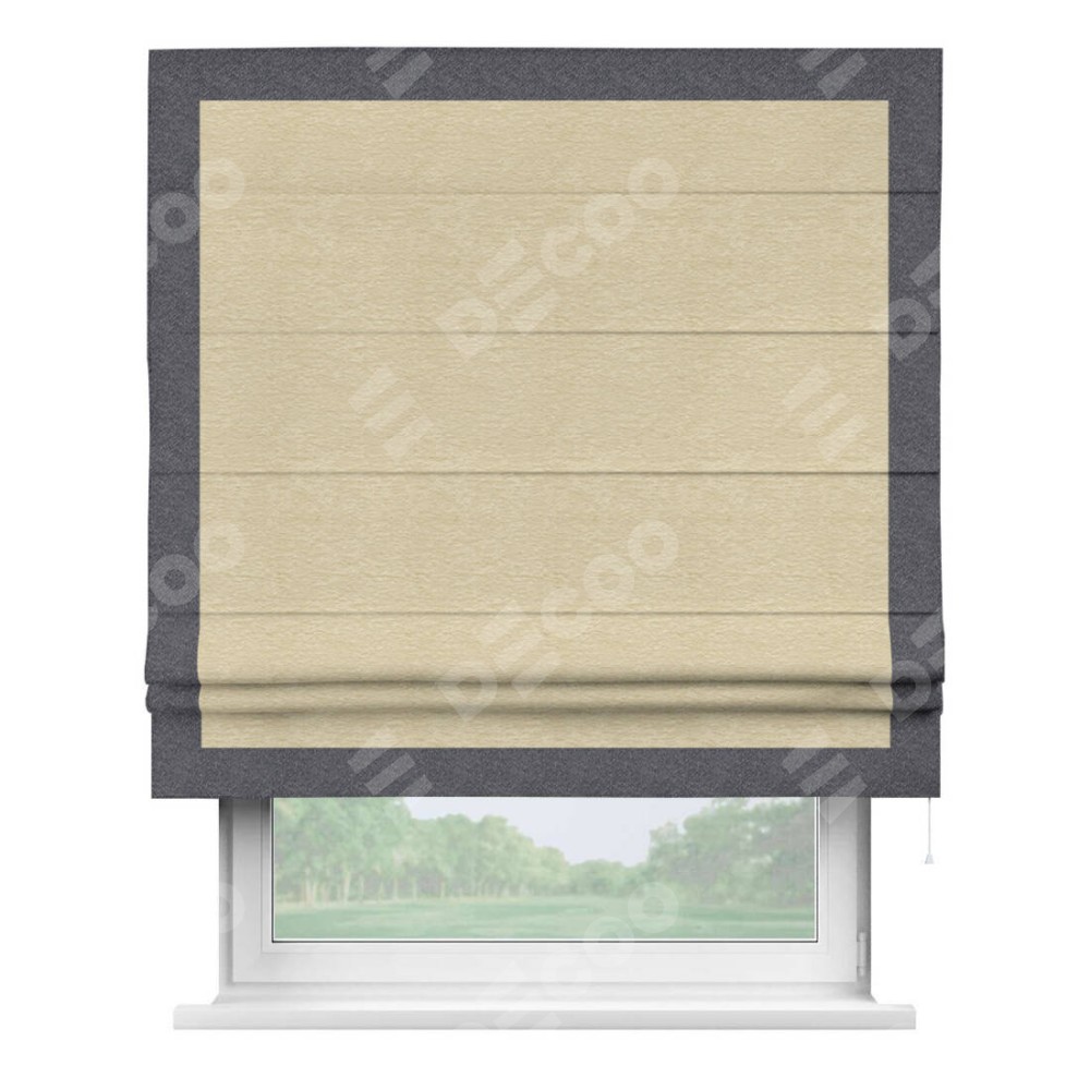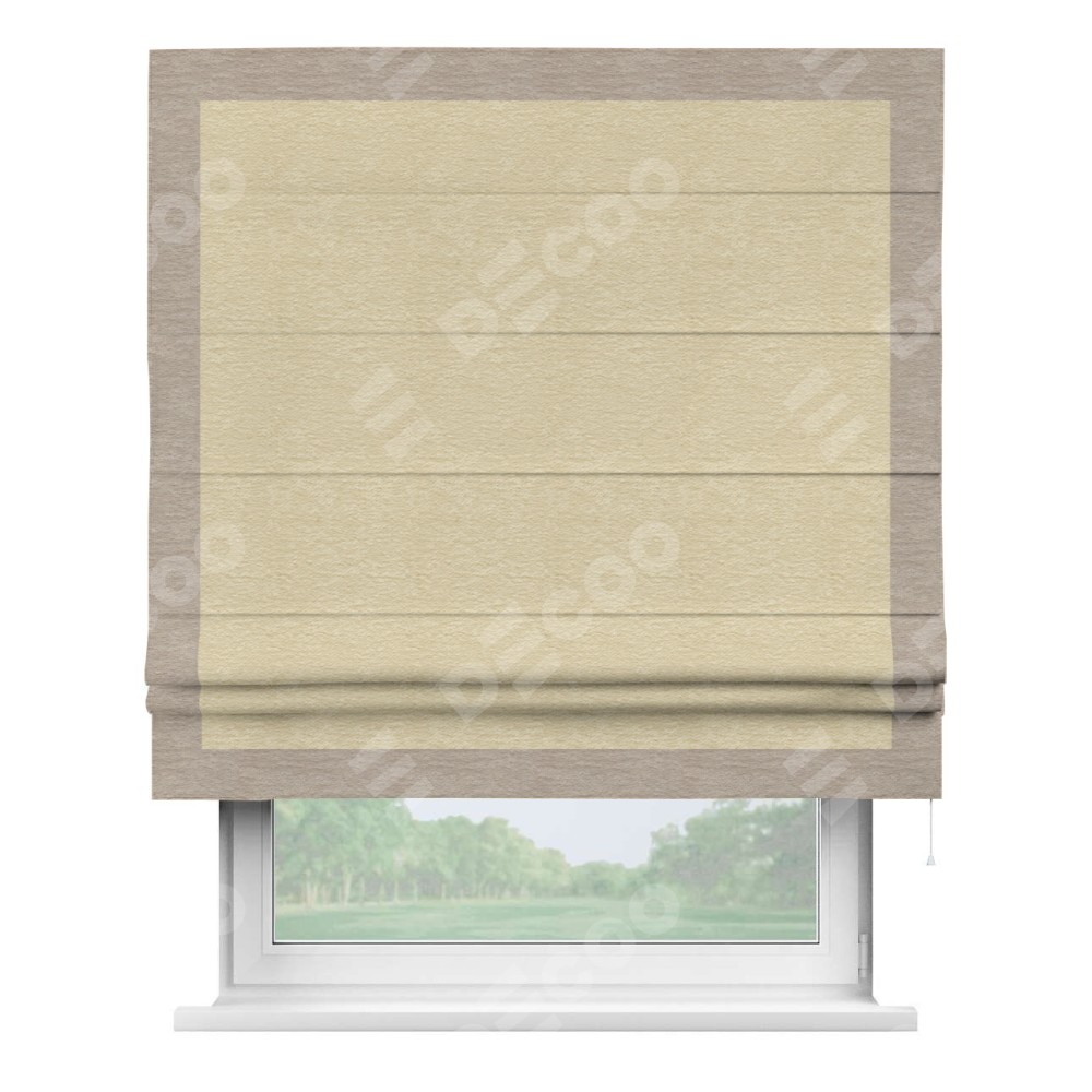 Римская штора производителя «Cortin», используется для проёма, пошита из ткани софт однотонный светло-бежевый, артикул 54426. Отделка шторы кантом «Чесс», ткань для канта используется из софта разной расцветки на выбор. Имеет универсальный механизм и подходит для монтажа: на потолок, на стену и в нишу.