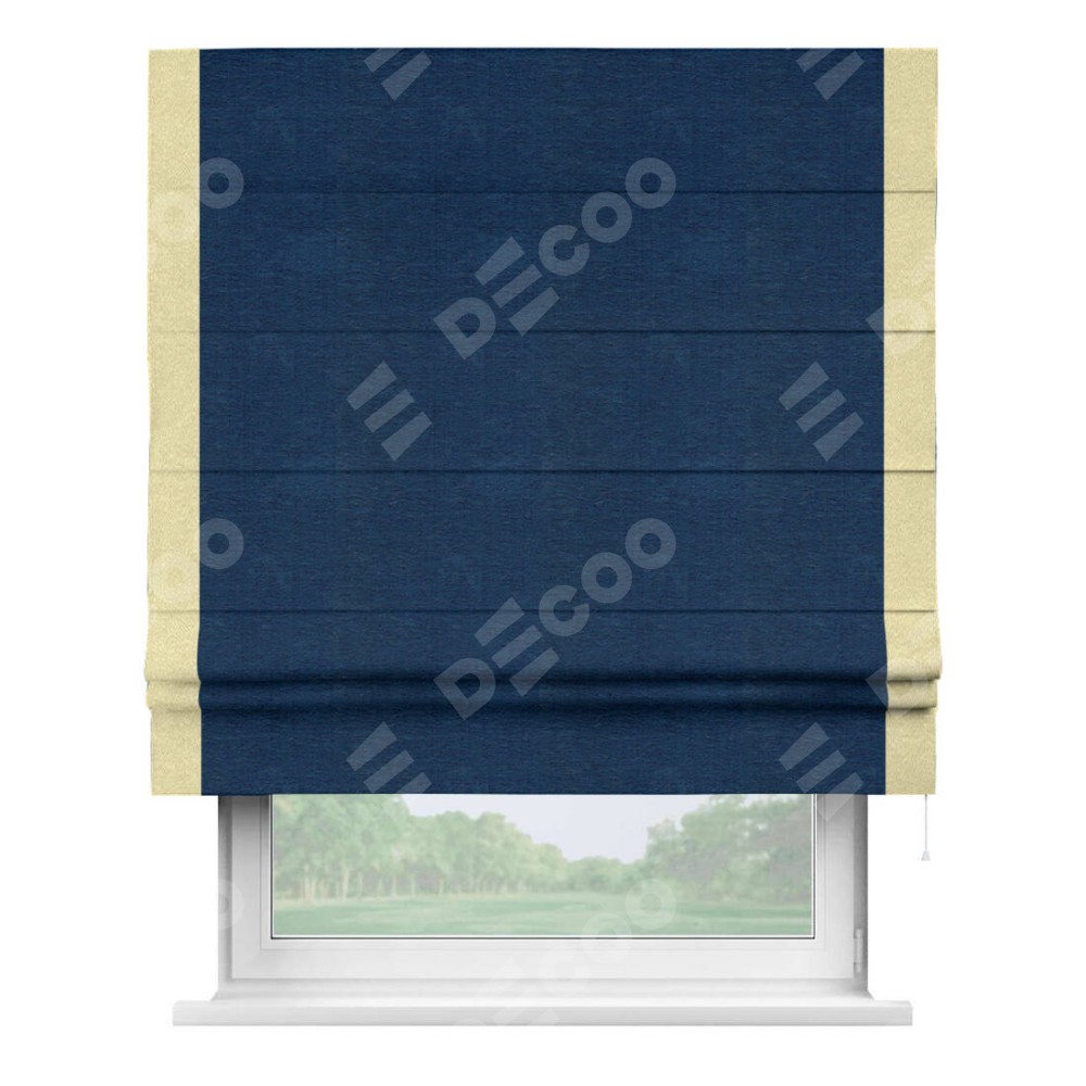 Римская штора производителя «Cortin», используется для проёма, пошита из ткани софт однотонный синий, артикул 42937. Отделка шторы кантом «Стрим Дуо», ткань для канта используется из софта разной расцветки на выбор. Имеет универсальный механизм и подходит для монтажа: на потолок, на стену и в нишу.