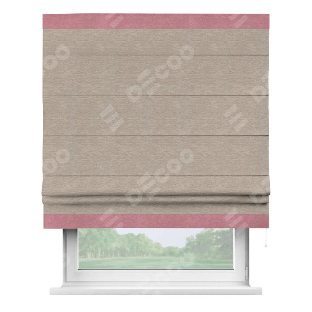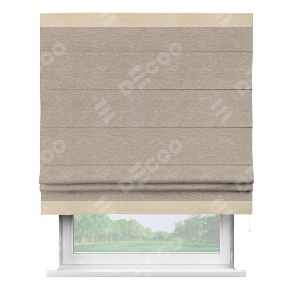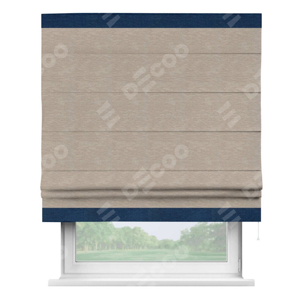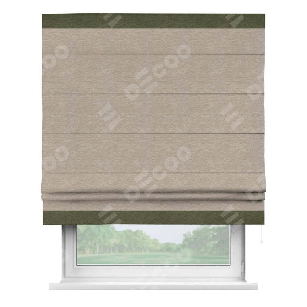 Римская штора производителя «Cortin», используется для проёма, пошита из ткани софт однотонный темно-бежевый, артикул 1640. Отделка шторы кантом «Горизонт», ткань для канта используется из софта разной расцветки на выбор. Имеет универсальный механизм и подходит для монтажа: на потолок, на стену и в нишу.