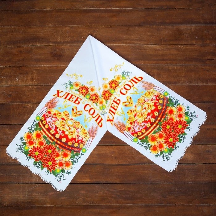 Рушник под ноги. Кто первым из молодых на него встанет — тому и быть хозяином в доме. Лучше отказаться от вариантов, на которых изображена пара голубей или лебедей, а также кольца. Считается, что супруги могут затоптать своё счастье. Лучше отдать предпочтение геометрическим или растительным узорам.