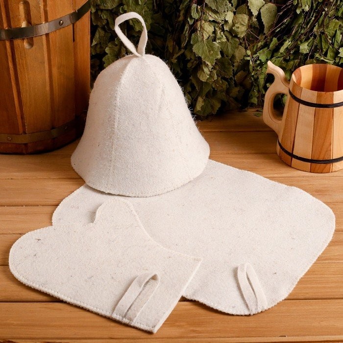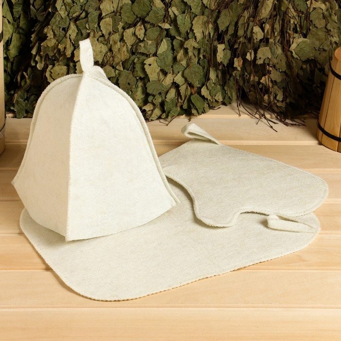 Для комфортного отдыха в парной возьмите с собой набор банных принадлежностей. Предметы из этого комплекта предохраняют тело от перегрева и являются средствами индивидуального пользования. Влажные изделия рекомендуется сушить в расправленном виде на горизонтальной поверхности. Принадлежности из войлока и фетра стирайте вручную при температуре воды 30 °C.