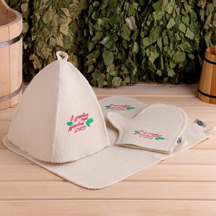 Для комфортного отдыха в парной возьмите с собой набор банных принадлежностей. Предметы из этого комплекта предохраняют тело от перегрева и являются средствами индивидуального пользования. Влажные изделия рекомендуется сушить в расправленном виде на горизонтальной поверхности. Принадлежности из войлока и фетра стирайте вручную при температуре воды 30 °C.