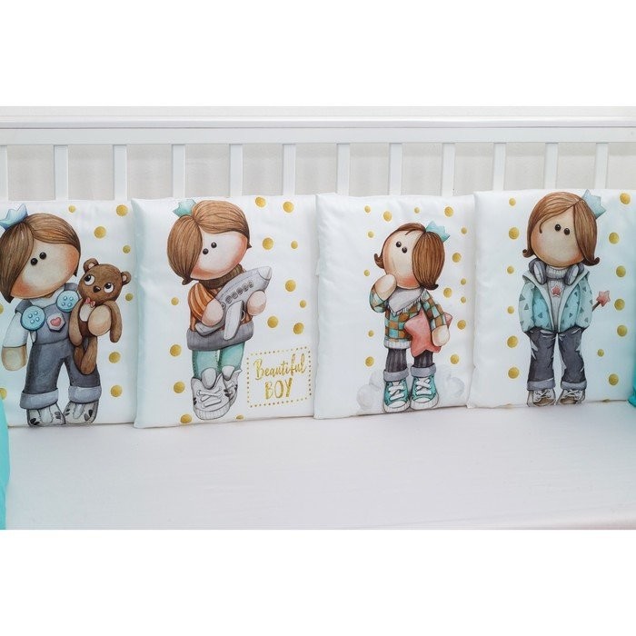 Бортики в роватку Крошка Я «Принц Тим», цвет белый/мятный, 35×35 см-8 шт, сатин