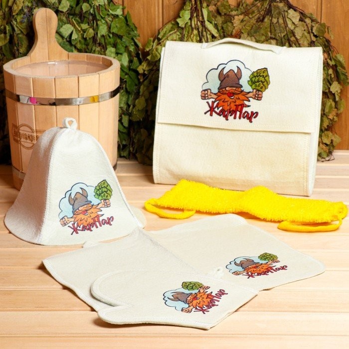 Для комфортного отдыха в парной возьмите с собой набор банных принадлежностей. Предметы из этого комплекта предохраняют тело от перегрева и являются средствами индивидуального пользования. Влажные изделия рекомендуется сушить в расправленном виде на горизонтальной поверхности. Принадлежности из войлока и фетра стирайте вручную при температуре воды 30 °C.